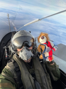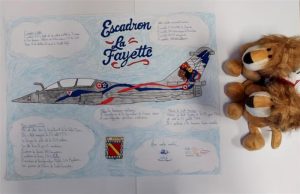 Each class is also accompanied by a lion mascot, Whiskey and Soda, symbolizing the Franco-American bond and serving as a nod to the Lafayette Escadrille’s own original mascots. The students hoped to have their mascots fly aboard fighter aircraft from the French Air and Space Force as well as the U.S. Air Force. This goal has already been achieved for one of the mascots, turning a dream into reality.